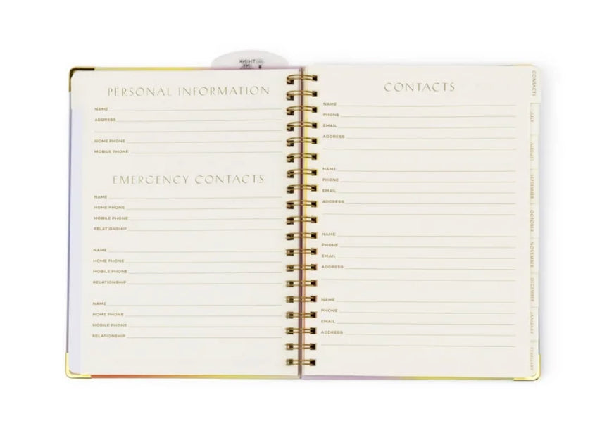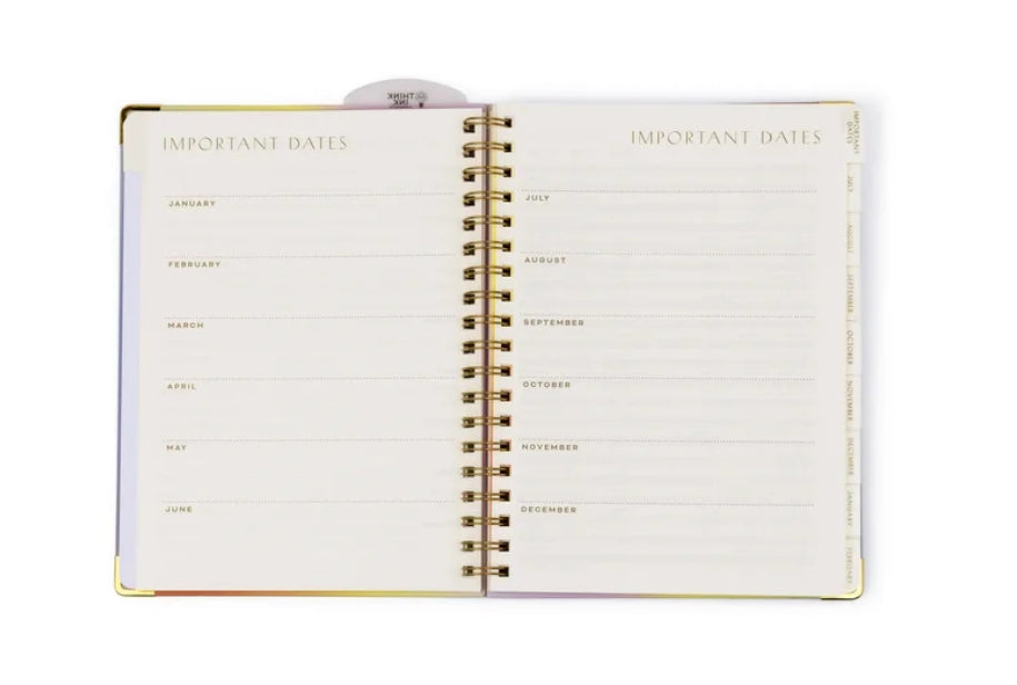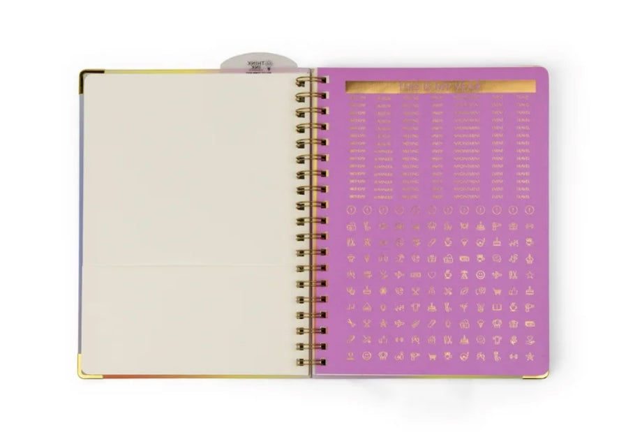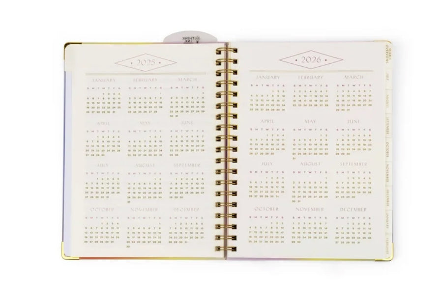 - Keep your schedule organized in style with Think Ink 12-Month Weekly Planner. Spanning from July 2025 to June 2026, it offers a year of organized planning. The interior pages provide ample space for detailed weekly scheduling, while the monthly calendar spreads provide a comprehensive view of your plans at a glance. Each month is tabbed for easy reference. Use the handy storage pocket for notes and receipts. Handy elastic closure keeps the cover closed before storage. The included sticker sheet features planes, cakes, blow dryers, and more to help you mark and remember important dates and meetings. Its convenient dimensions of 7.5 by 10 inches make it an ideal companion for students on the move or a handy tool for managing daily activities at home.