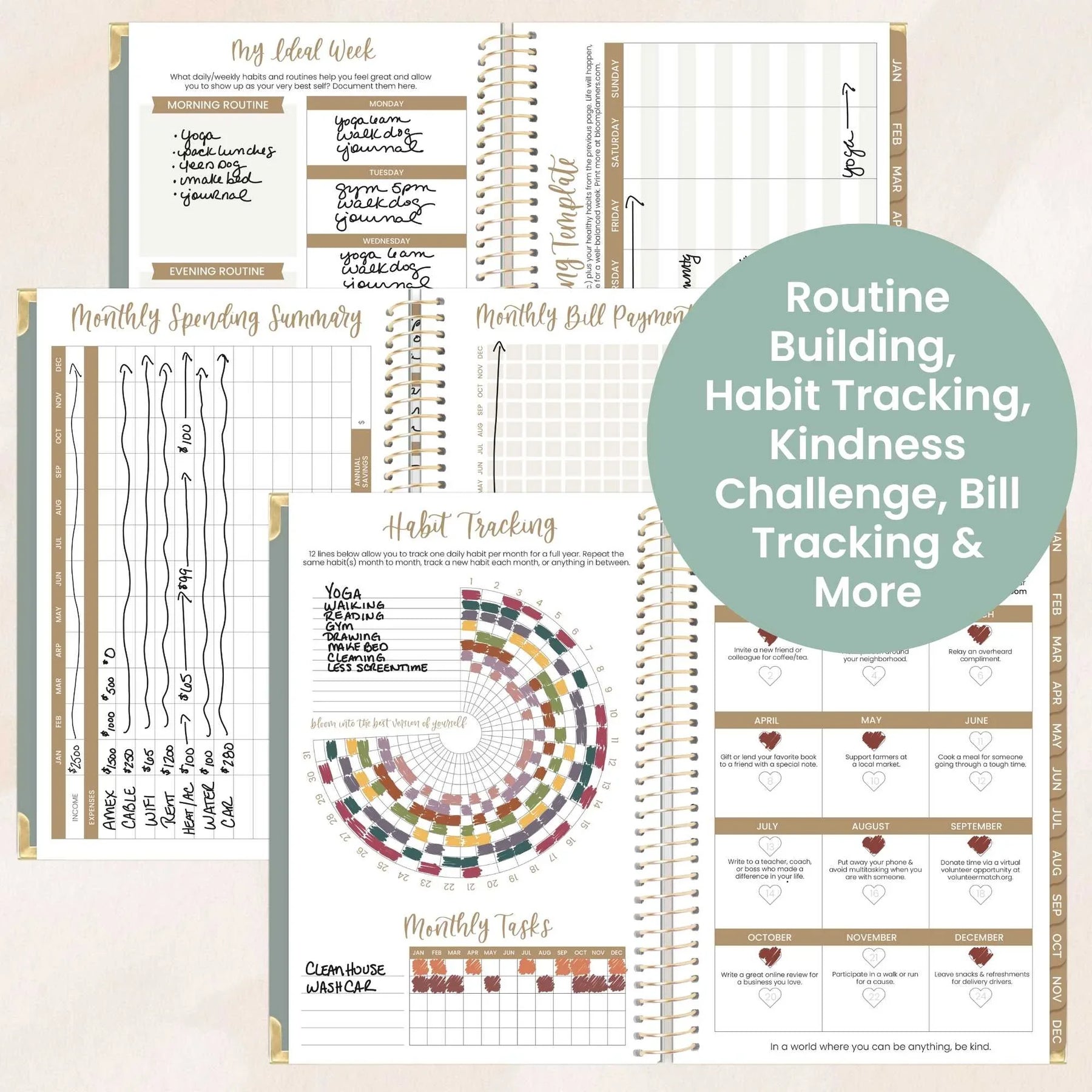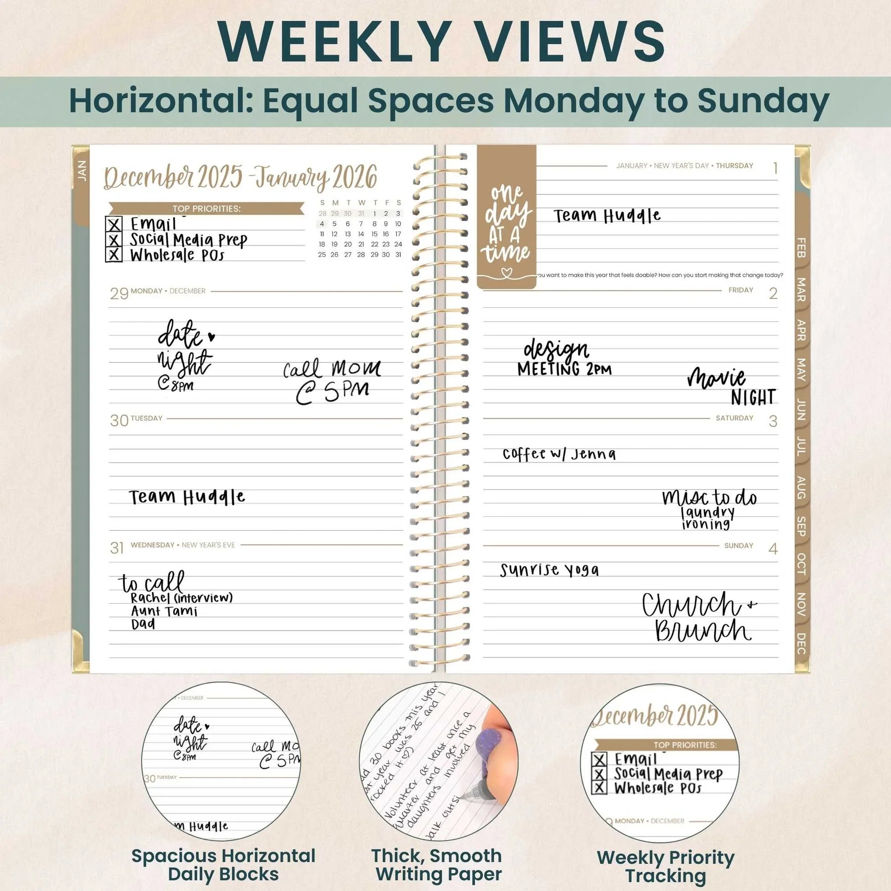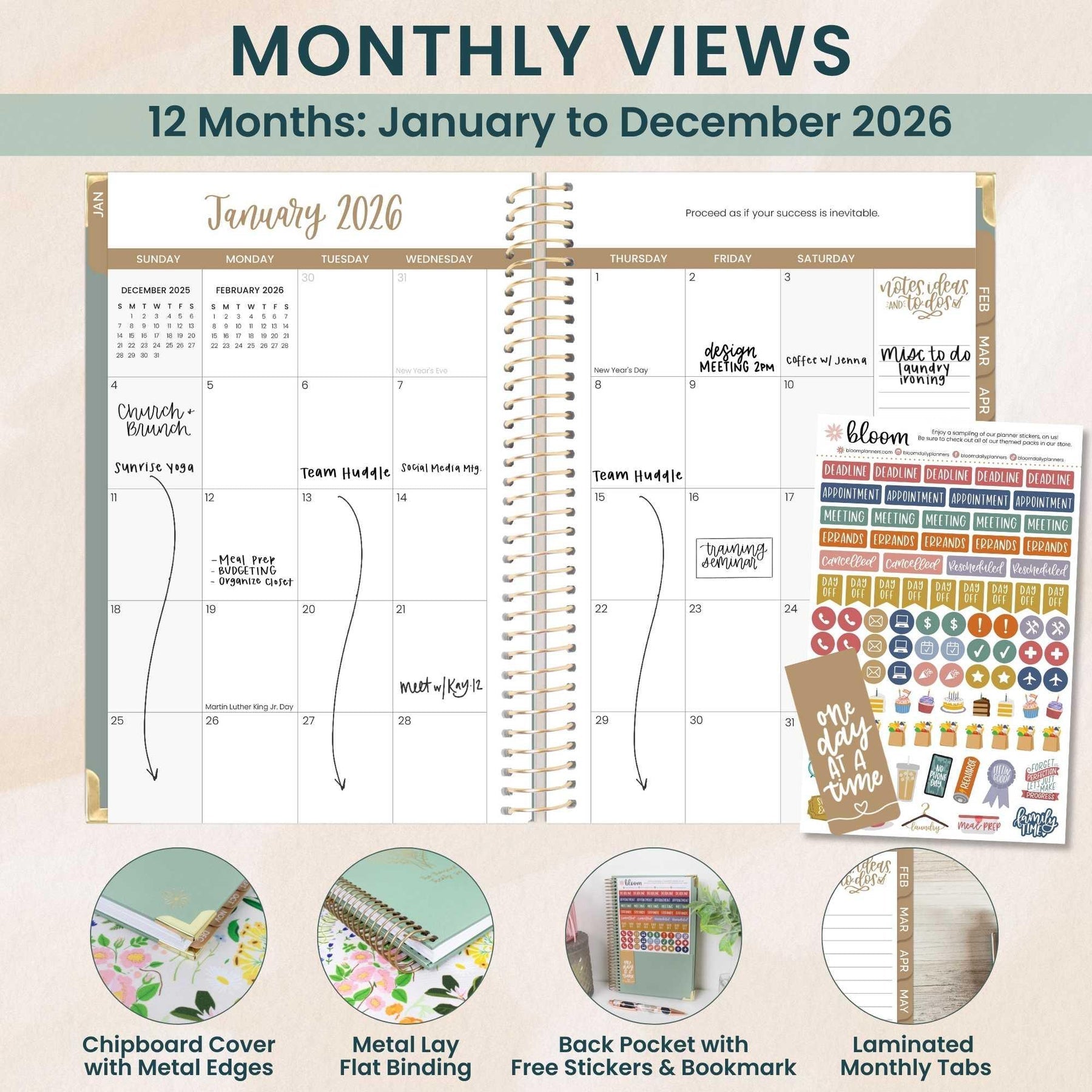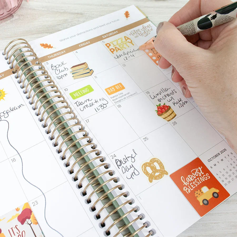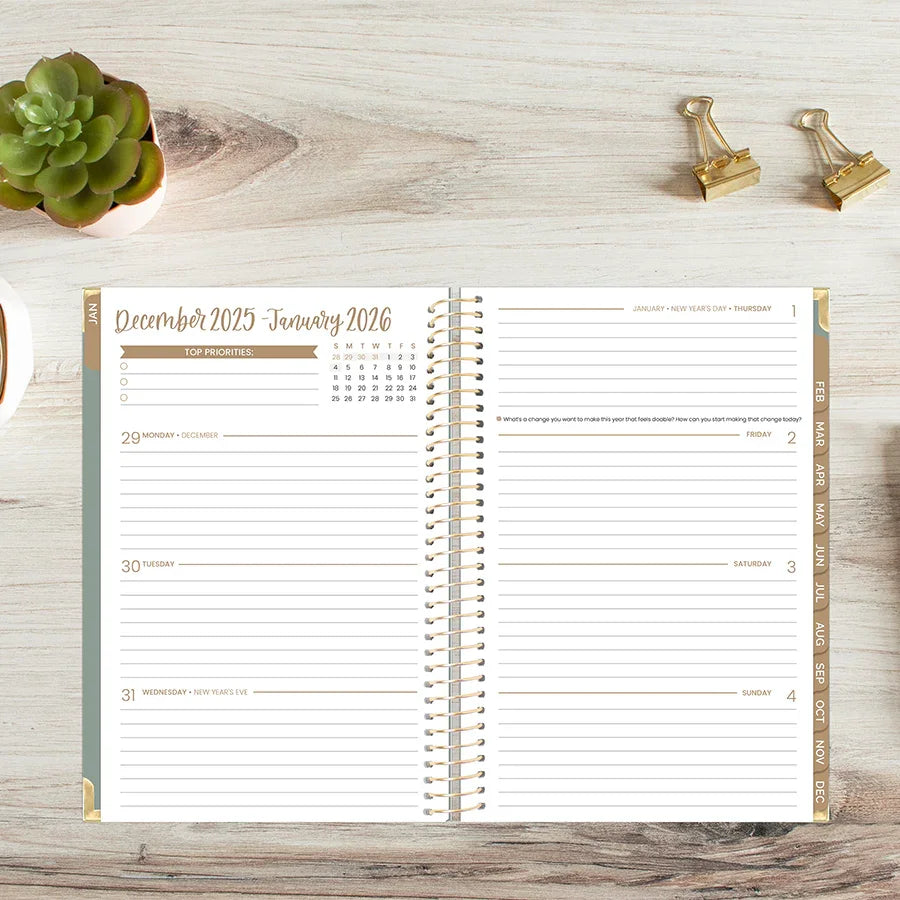 Stay on top of your year with the 2026 Small Green Linen Hard Cover Planner from bloom. This compact companion features a soft linen-textured cover, gold metal binding, and reinforced corners built to handle daily use. Inside, you'll find 12 months of dated spreads with generous weekly layouts, monthly overviews, and thoughtful prompts to keep your goals visible and your days intentional. The smooth 100gsm paper welcomes pens and markers without ghosting, while a back pocket stashes notes and receipts. Bonus: every planner arrives with a coordinating sticker sheet and magnetic bookmark to make planning feel less like a chore and more like a creative ritual. Perfect for students, professionals, and anyone ready to turn scattered thoughts into purposeful action.