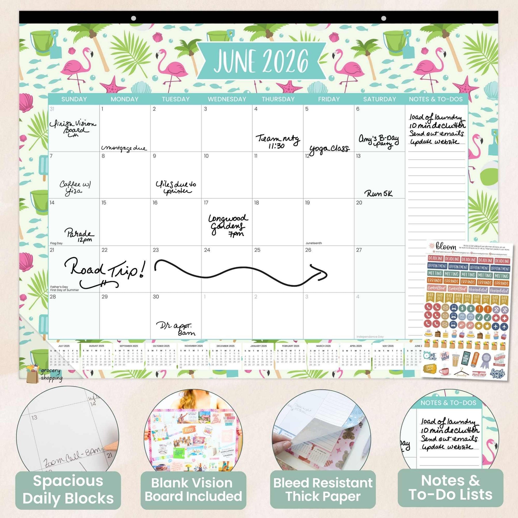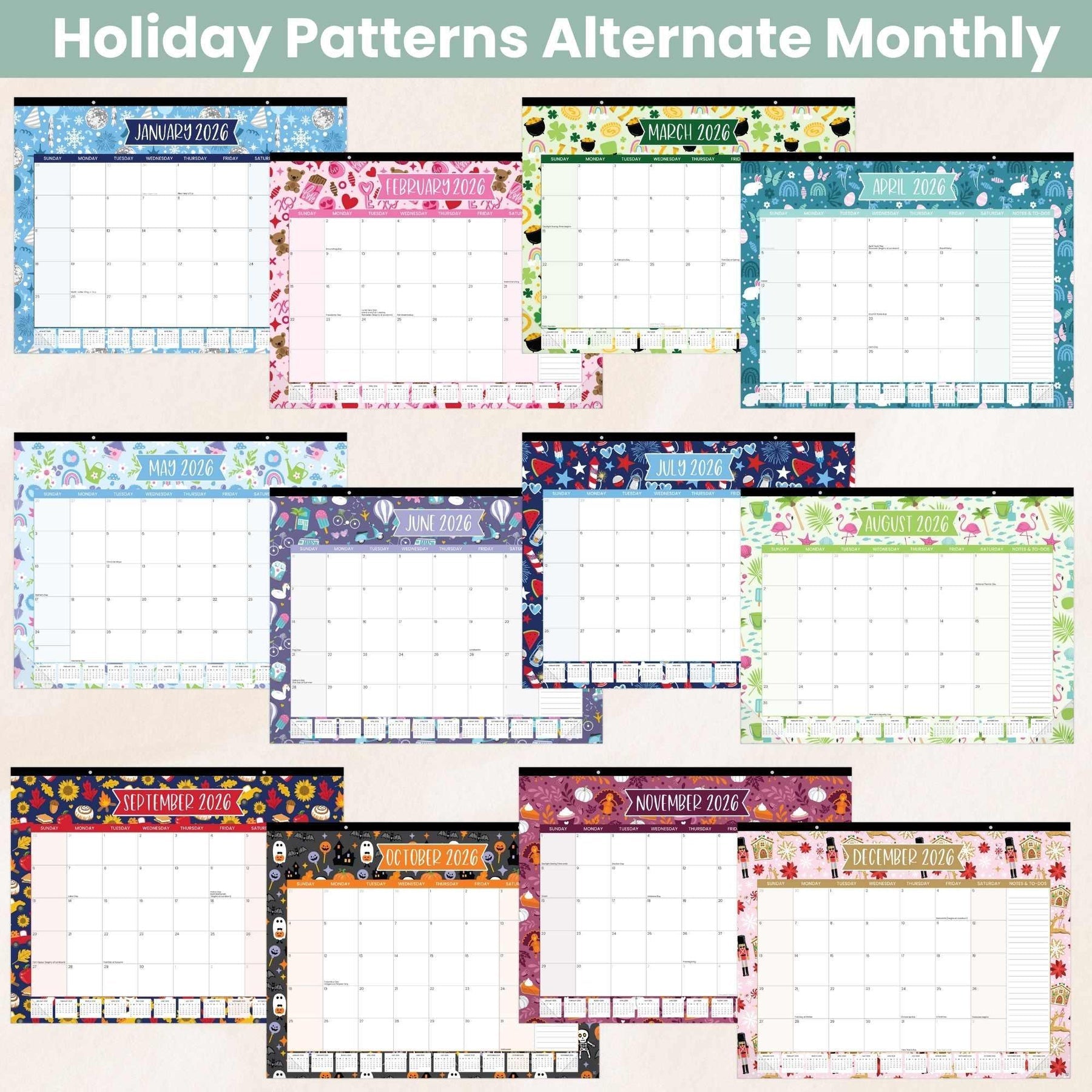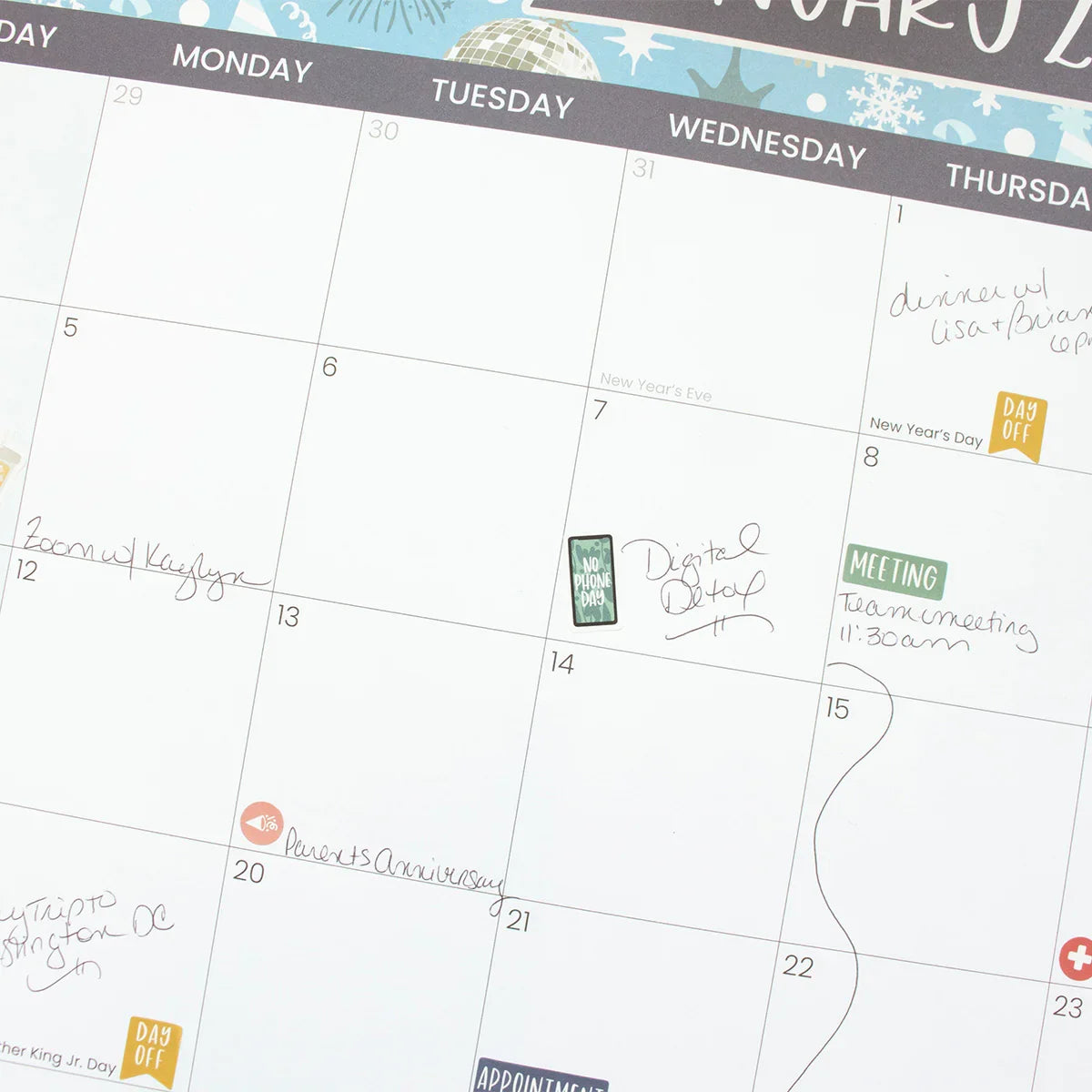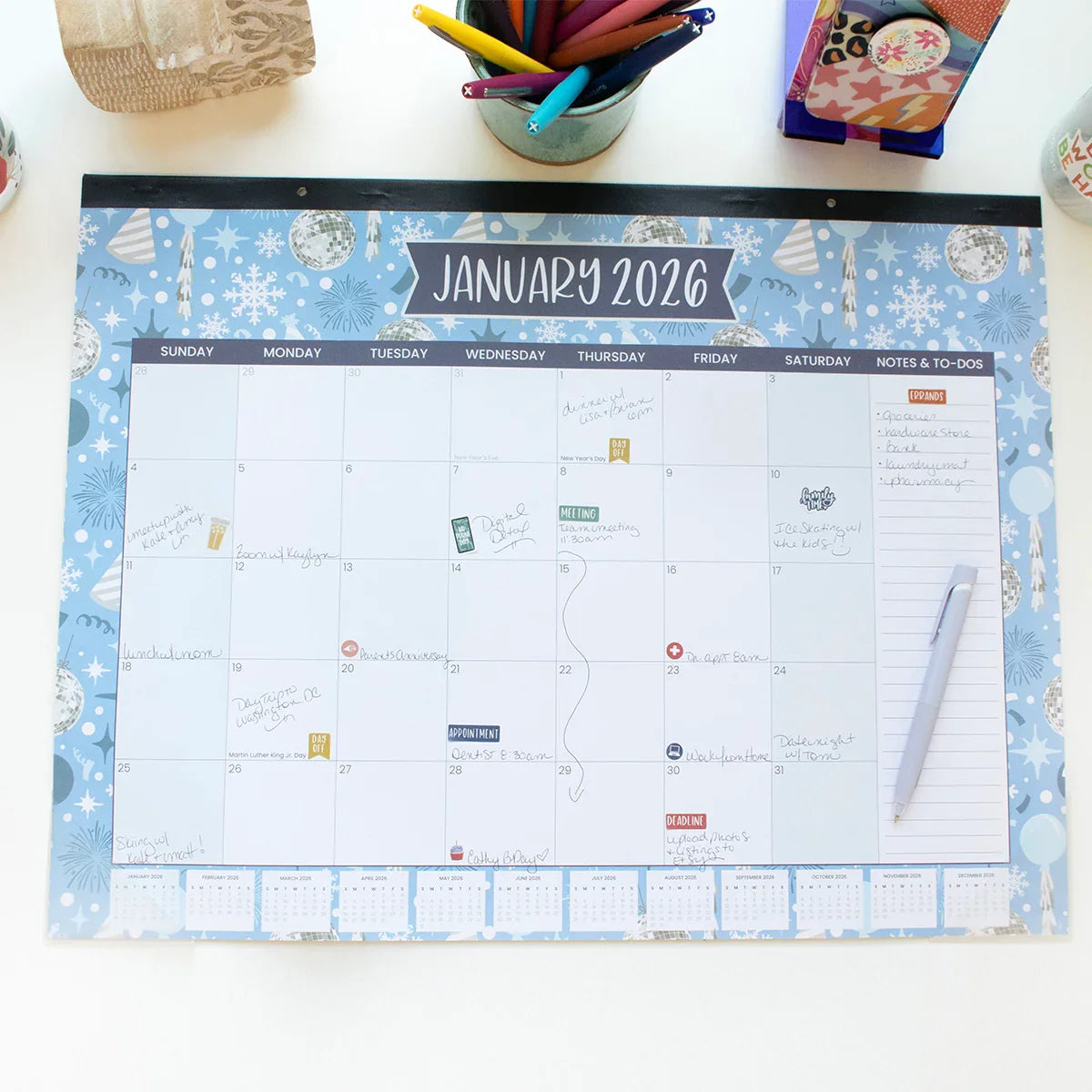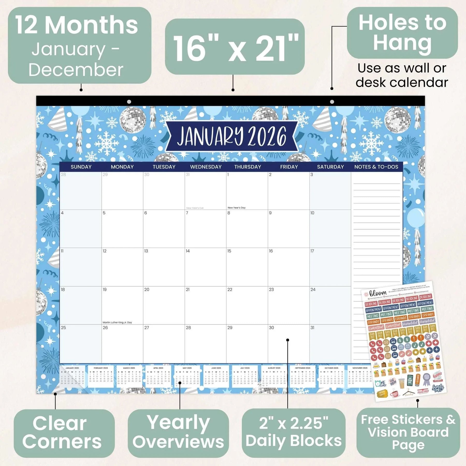 Stay organized in style with the 2026 Desk & Wall Calendar Holiday Icons—your new favorite planning companion. This stunning 16" x 21" calendar transforms mundane scheduling into a creative ritual, featuring vibrant holiday-themed artwork that brightens any workspace. Packed with spacious monthly grids, pre-printed holidays, and a bonus sticker sheet, it's built for professionals, families, and anyone juggling multiple priorities. Display it on your desk or wall with the included corner sleeves, and let the thoughtfully designed pages keep you motivated all year long. From project deadlines to birthday celebrations, every important moment gets its moment to shine. Because planning should feel as good as it looks.